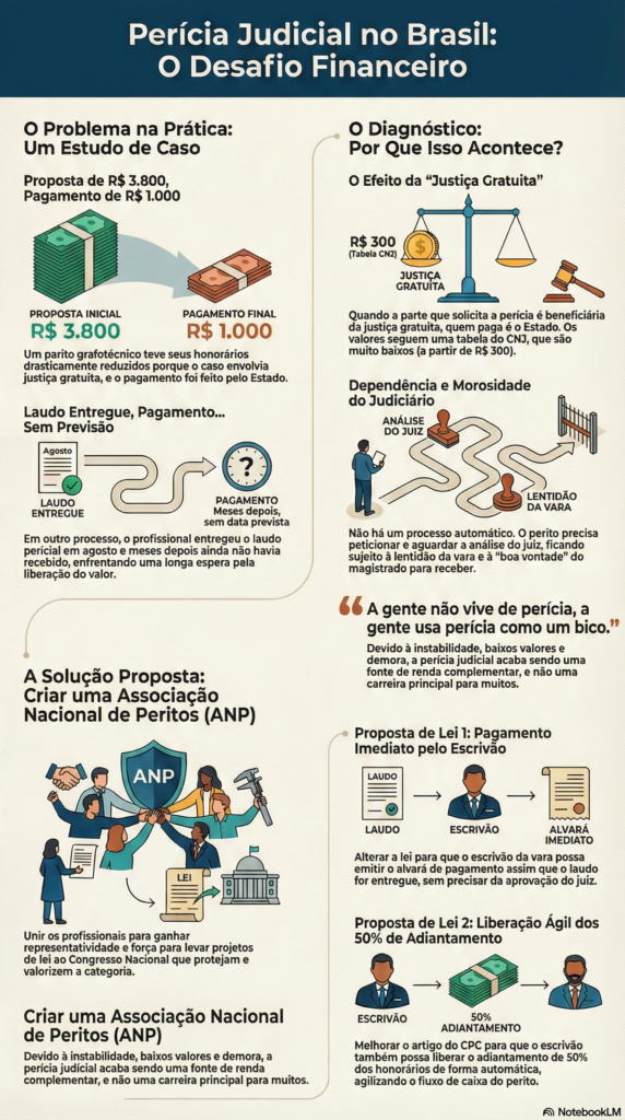 Um dos momentos mais sensíveis da atuação pericial ocorre após a entrega do laudo, quando o profissional aguarda a fixação e liberação dos honorários. O vídeo analisado apresenta um caso emblemático: um perito grafotécnico apresentou proposta no valor de R$ 3.800,00, executou integralmente a perícia e, ao final, teve seus honorários arbitrados judicialmente em apenas R$ 1.000,00.