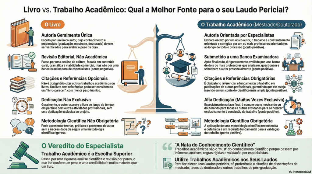 Embora livros técnicos possuam valor indiscutível, os trabalhos acadêmicos de mestrado e doutorado oferecem maior robustez científica, rigor metodológico e segurança jurídica. Ao fundamentar cada afirmação com base em pesquisas validadas por pares, o perito fortalece seu laudo, preserva sua credibilidade profissional e contribui de forma efetiva para a correta prestação jurisdicional.