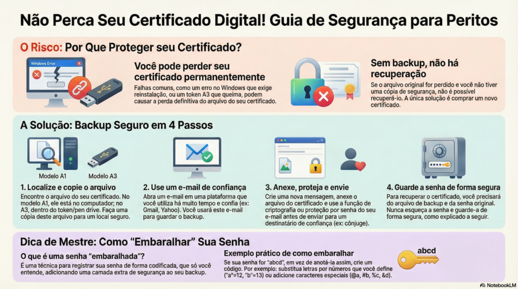 Tão importante quanto o arquivo do certificado é a senha que o protege. Sem ela, mesmo com o backup correto, a recuperação torna-se inviável.