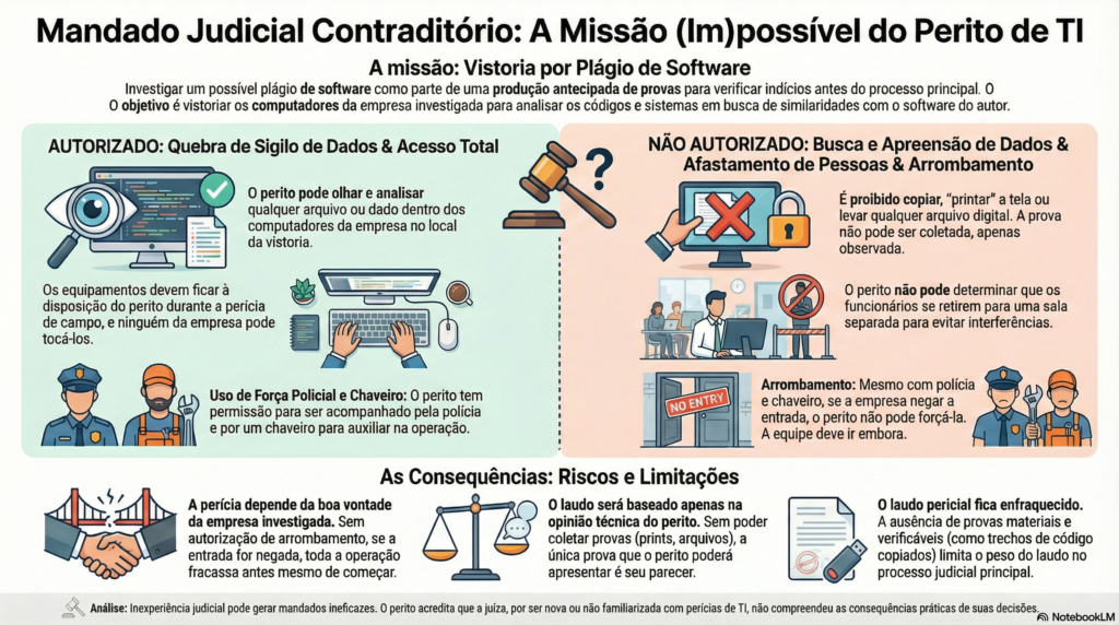 Este artigo analisa os desafios enfrentados pelo perito judicial em diligências de busca e apreensão digital, especialmente quando o mandado judicial é mal delimitado ou excessivamente restritivo. A partir de um caso concreto de produção antecipada de provas em suspeita de plágio de software, demonstra-se como a ausência de autorização expressa para coleta de dados, apreensão de evidências e arrombamento pode inviabilizar a prova. O texto também destaca o dever técnico do perito de alertar o juízo sobre os riscos de um mandado insuficiente, reforçando a necessidade de decisões mais alinhadas à realidade técnica da perícia digital.