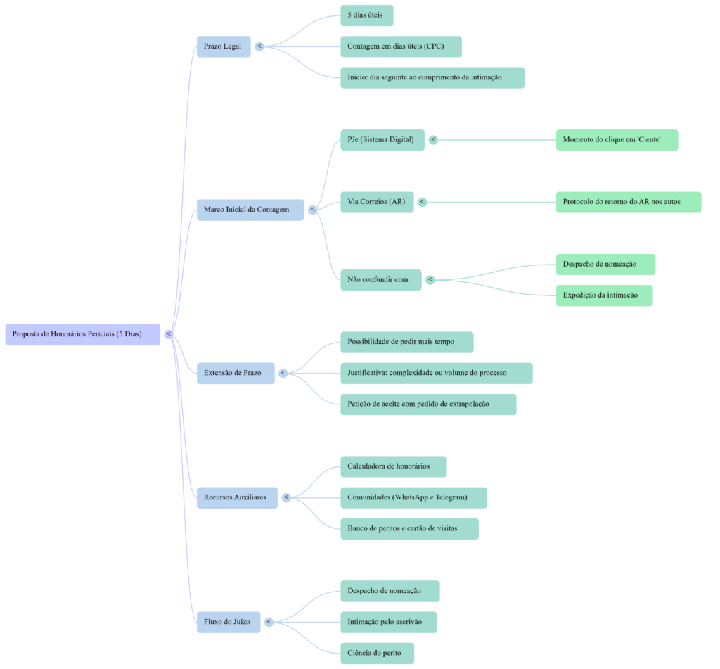 | Apresentação da proposta de honorários | 5 (cinco) | Úteis | No dia útil seguinte ao cumprimento da intimação | Código de Processo Civil (CPC) | Sim, mediante petição que justifique a complexidade (ex: grande volume de páginas) | O prazo não se inicia no despacho de nomeação, mas sim após a ciência ou cumprimento da intimação no sistema ou protocolo do AR. |