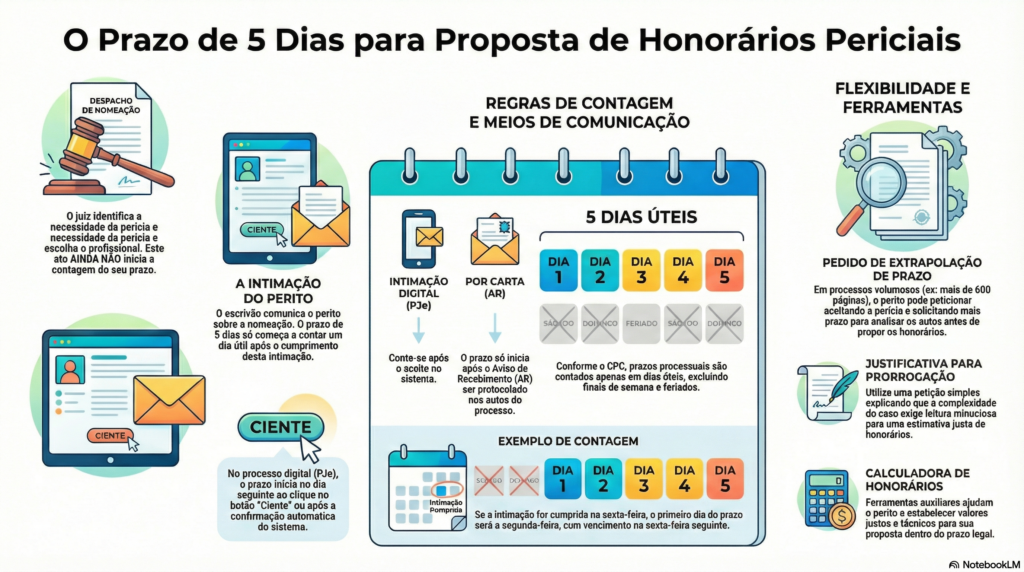 Essa distinção é fundamental, pois evita que o perito, por excesso de zelo, antecipe indevidamente sua proposta ou, ao contrário, seja surpreendido por um prazo que já começou a correr sem que ele tivesse ciência formal do marco legal.