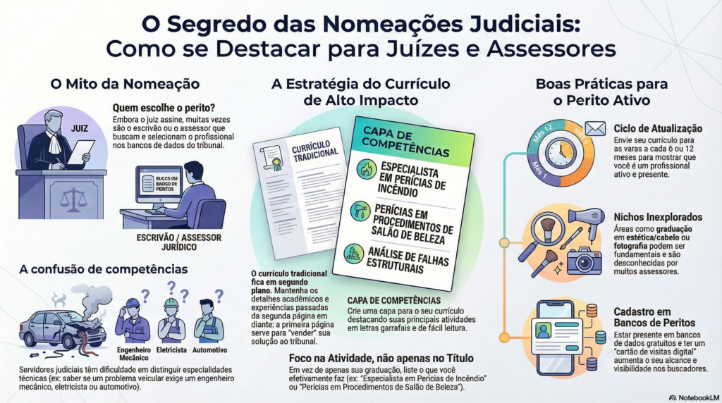 Este artigo analisa a dinâmica operacional da nomeação de peritos judiciais, demonstrando que, na prática, o processo decisório é amplamente mediado por servidores da serventia judicial, e não exclusivamente pelo magistrado. Sustenta-se que a dificuldade dos operadores do Direito em distinguir competências técnicas específicas constitui um fator crítico de exclusão involuntária de profissionais qualificados. Como resposta a esse cenário, propõe-se uma reestruturação estratégica da comunicação institucional do perito, por meio da elaboração de currículos orientados por atividades práticas e pela manutenção periódica da presença institucional junto às Varas. Conclui-se que a nomeação pericial depende não apenas da qualificação técnica, mas da capacidade do perito em tornar sua competência inteligível ao sistema judicial.