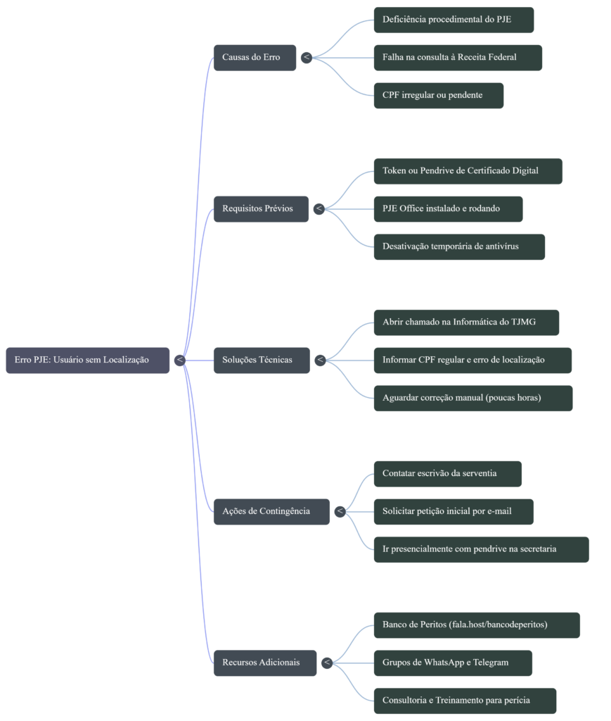 Este guia de estudo foi desenvolvido com base nas orientações técnicas para peritos judiciais sobre como proceder ao encontrar o erro “Usuário sem localização” ao acessar o sistema de Processo Judicial Eletrônico (PJE), especificamente no contexto do Tribunal de Justiça de Minas Gerais (TJMG).