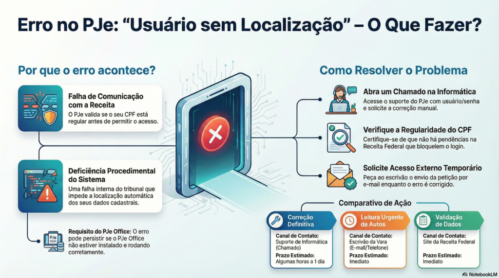 | Usuário sem Localização | Erro específico do PJE que indica uma falha na vinculação dos dados do usuário ou na consulta automática à base da Receita Federal. |