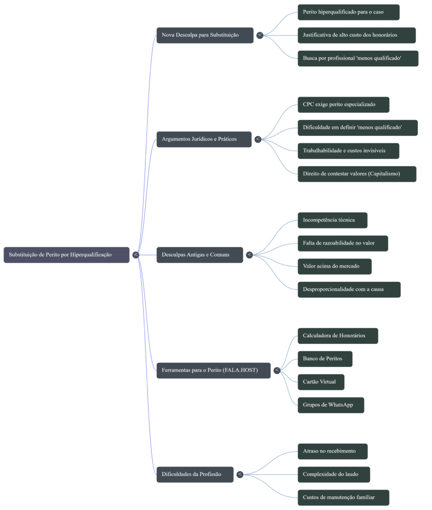 | Hiperqualificação | O perito possui qualificações excessivas (como doutorado ou especializações internacionais) desnecessárias para a simplicidade da causa, tornando o custo do trabalho desproporcional. | Crítica: O CPC exige que o perito seja especializado no objeto da perícia; não existe previsão legal para “desqualificar” por excesso de estudo, sendo uma tentativa de burlar o valor. | Quando o perito apresenta uma proposta de honorários considerada alta ou “salgada” pelas partes. | Busca a substituição por um profissional que aceite um valor menor, sob o pretexto de que um técnico com menos anos de estudo bastaria. | [1] |
