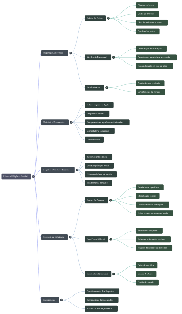 Preparação PréviaElaboração do Roteiro de PeríciaCriar um documento com objeto, endereço, nome das partes, assistentes técnicos, número do processo e todos os quesitos para servir de guia e rascunho.Antes de agendar a perícia no processo.Garante que nenhum ponto técnico ou quesito judicial seja esquecido, evitando omissões que geram pedidos de esclarecimentos ou nulidade.[1]