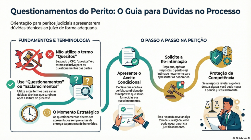 O perito judicial pode apresentar questionamentos próprios antes da formalização definitiva do encargo, especialmente quando identifica lacunas, contradições ou insuficiência documental nos autos. Embora o CPC reserve o termo quesitos às perguntas formuladas pelas partes e pelo juízo, o perito pode peticionar requerendo esclarecimentos, complementações documentais ou delimitação do objeto, preferencialmente por meio do chamado aceite condicional.