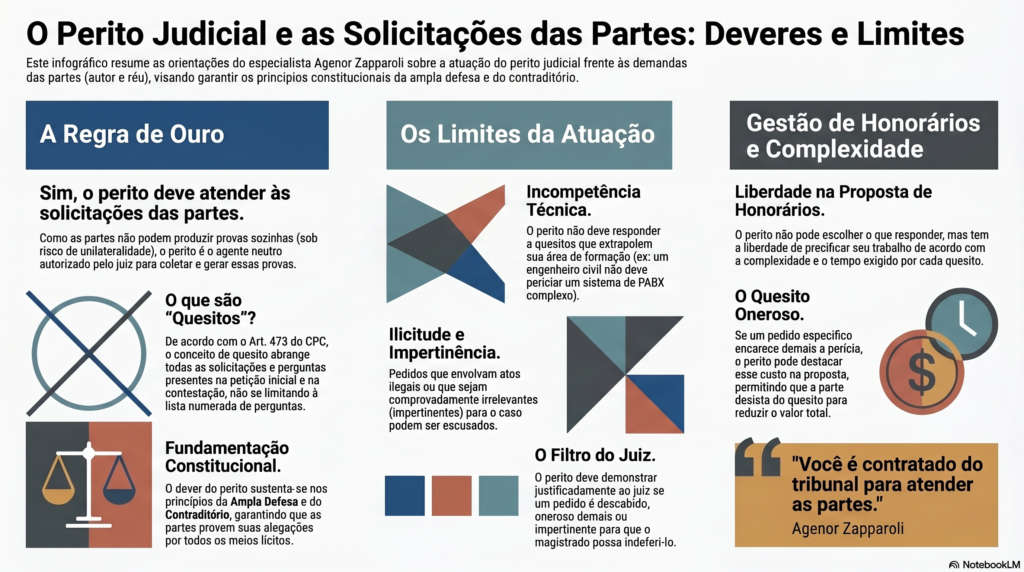 Este artigo detalha as principais orientações apresentadas no vídeo do canal Perícia Judicial, onde o perito Agenor Zapparoli esclarece se o profissional nomeado pelo juiz tem o dever de atender a todas as solicitações feitas pelas partes envolvidas no processo.