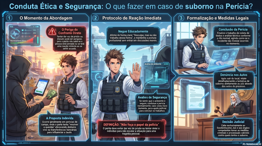 A tentativa de suborno na perícia judicial representa uma grave violação ética e jurídica, que exige do perito uma resposta técnica equilibrada, pautada na prudência, na legalidade e na autoproteção. Embora a oferta de vantagem indevida configure ilícito penal, a reação imediata em campo deve priorizar a segurança pessoal e a continuidade da diligência, evitando confrontos diretos ou medidas que extrapolem a capacidade operacional do profissional.